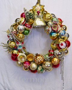 A large (approx. 24” diameter) wreath with a lovely ceramic & foil angel and bottlebrush tree on top to set the mood. This stunner also has a Bradford plastic topper, Shiny Brites, and a huge red & gold teardrop reflector. With a host of angels including a sassy little one in a white plastic diarama ornament, a yellow Jewelbrite teardrop, and others. So many special ornaments make up this lovely wreath finished with a drippy silver garland. $295 SOLD