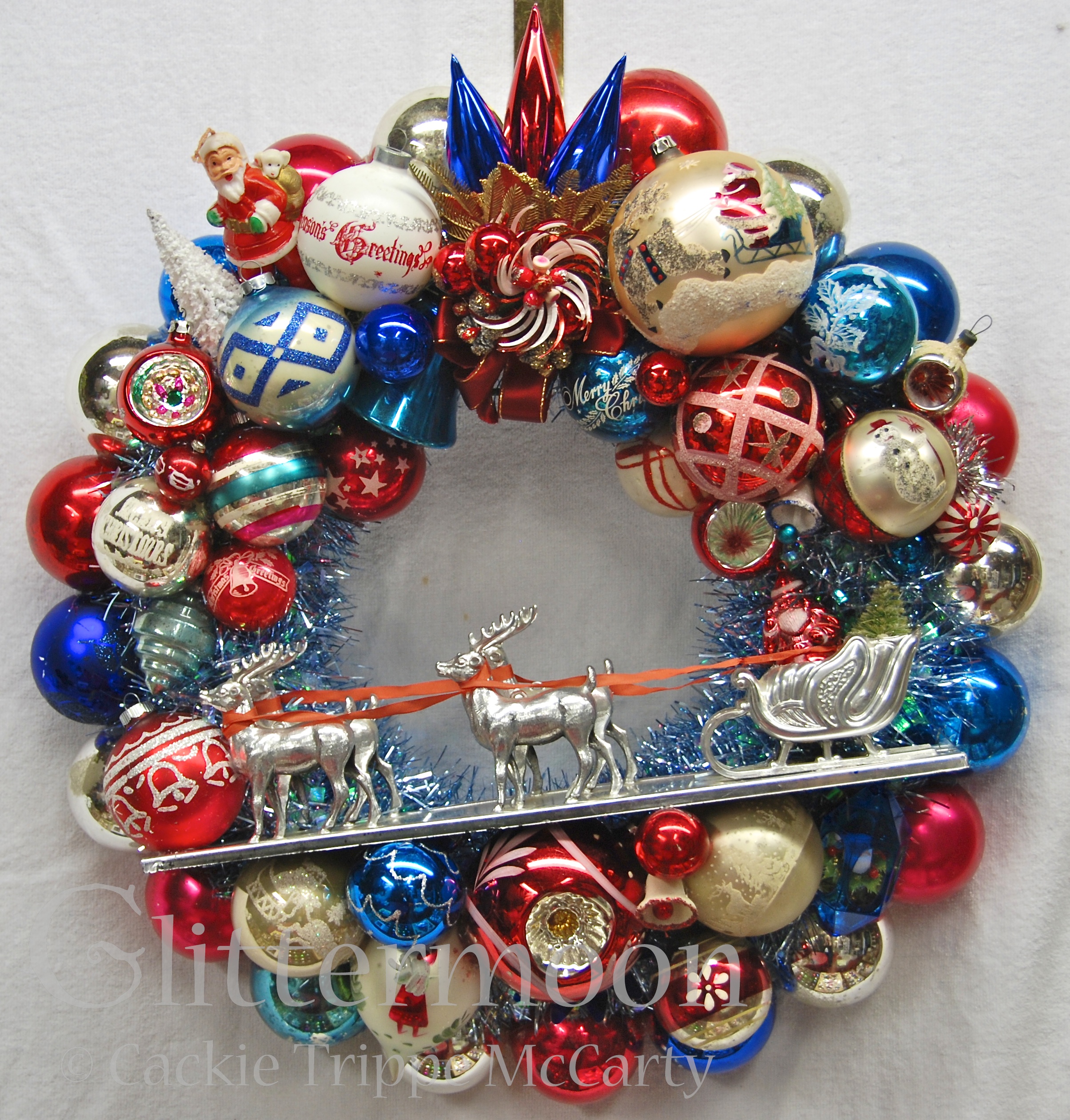 A stunning concoction with the perfect colors for an election year. Featuring an unusual sliver plastic sleigh and reindeer with Santa and tree aboard, a wonderful jumbo Poland painted ball, and a host of other treasures. Approx. 20″ diameter. Comes with a nice, zippered storage bag.
