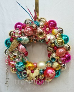 A delectable confection loaded with glitz and glamor in predominantly pastel tones of pink & teal-aqua with gold & silver highlights. Pops of hot pink ramp up the deliciousness. Featuring so much fab stuff: a gold topper, a white deer, a Polish elf finial ornament, a little vintage glass Santa on top, and a myriad other treasures from Shiny Brites to Polands and more. Yummy. Approx. 20″ diameter not including protruding or drippy bits.