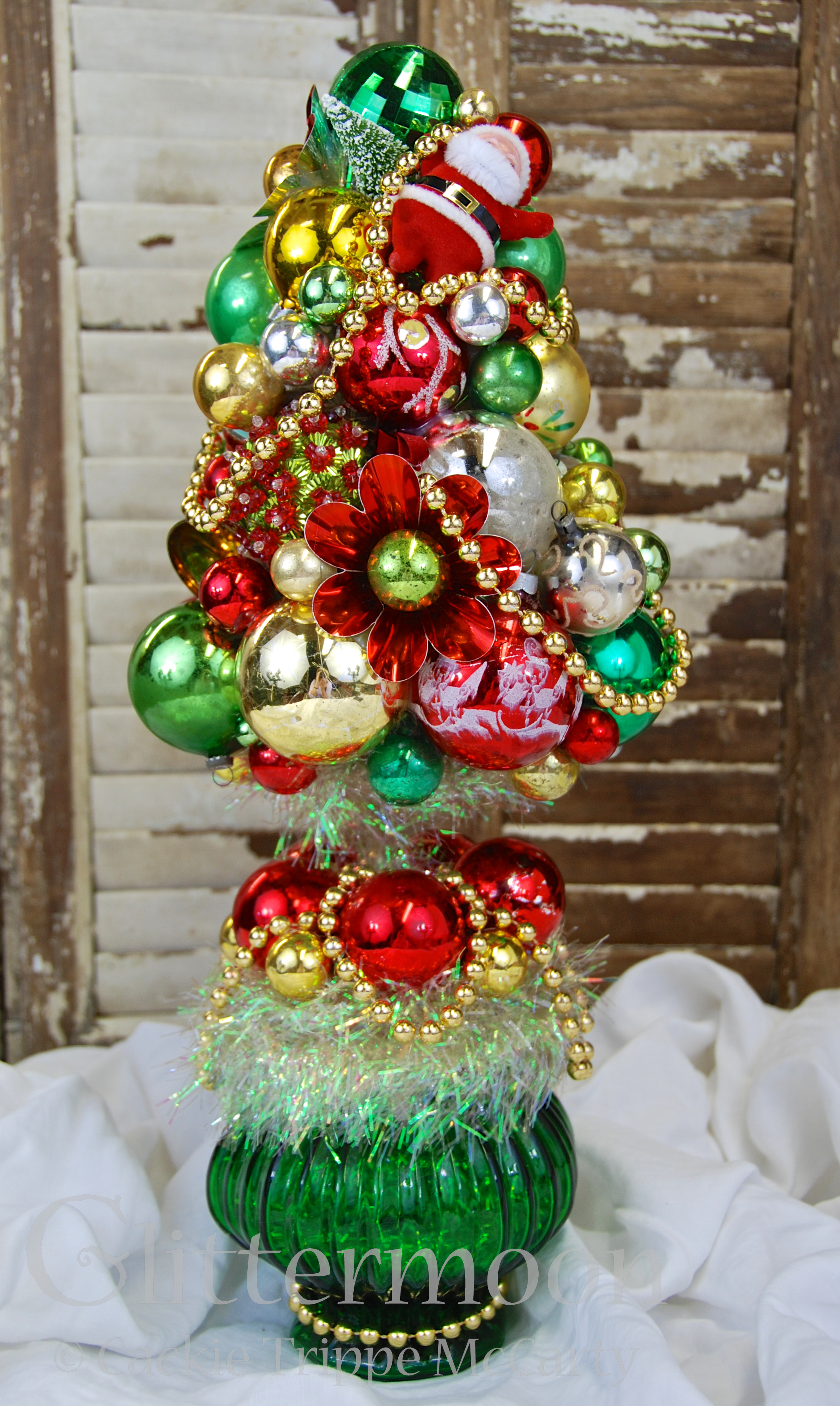 Traditional Christmas colors of red, green, gold, and silver atop a vintage green glass vase. $125 SOLD