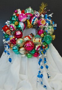 The littlest one of all but so much fun is packed in! With a charming figural toy soldier among the other treasures. Vintage blue & silver tinsel garland add a finishing touch. 14″ diameter, not including the drippy and protruding bits. $125 (NOTE: A storage bag does NOT come with this little one.) ** SOLD **