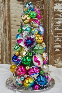 A custom order, this beauty features magentas, blues, and greens with pops of yellow, gold and silver. Mounted on a silver-plate base with vintage silver tinsel as a background. $250 SOLD
