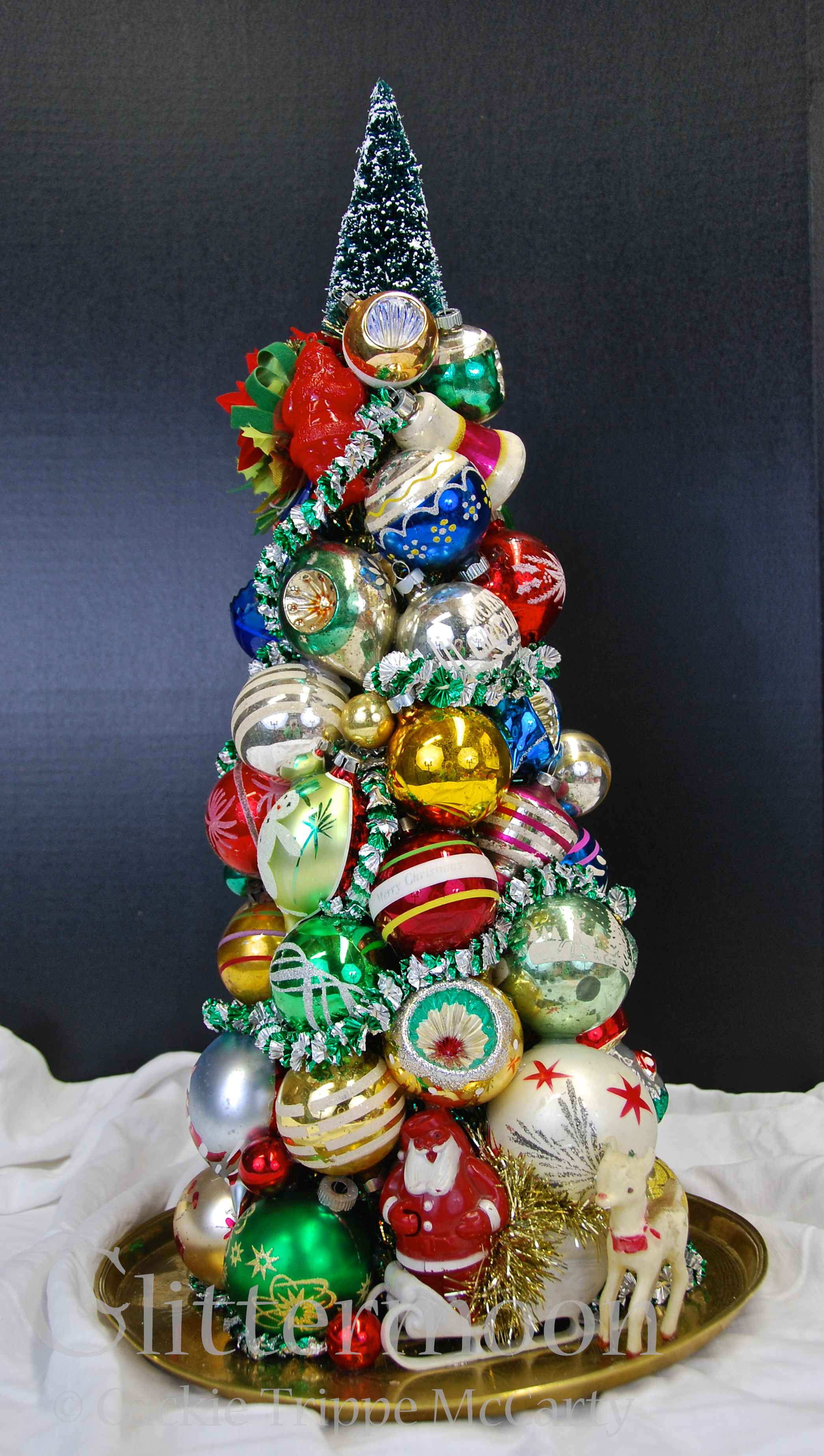 This one is a large topiary in fabulous traditional Christmas colors mounted on a vintage brass tray. With a cool vintage Santa and sleigh candy holder on the bottom, Rudolph at Santa’s side, and a bottlebrush tree on top. What a centerpiece! $275 **SOLD **