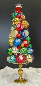 Mounted on a heavy brass candleholder, this fun topiary has all the traditional Christmas colors. Lots of treasures are included, topped off by a little boot. $150 ** SOLD **