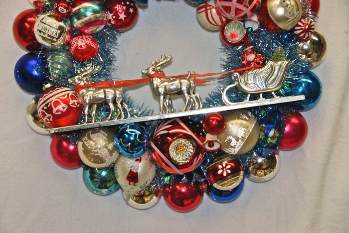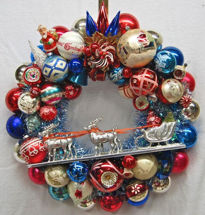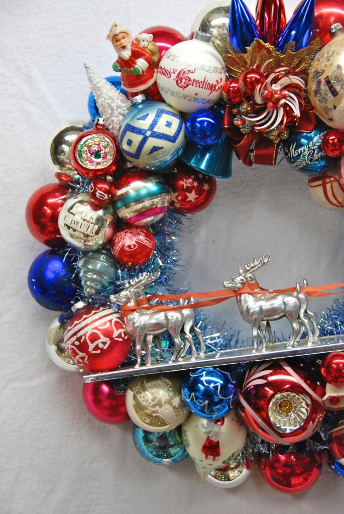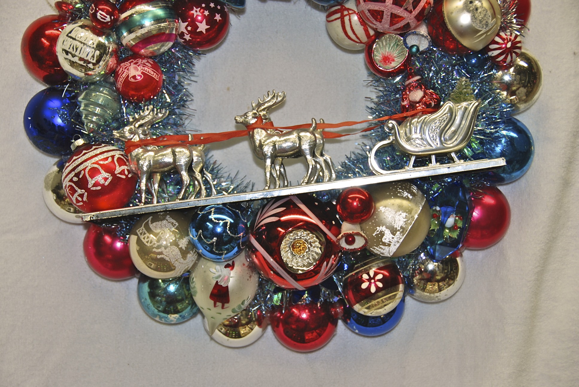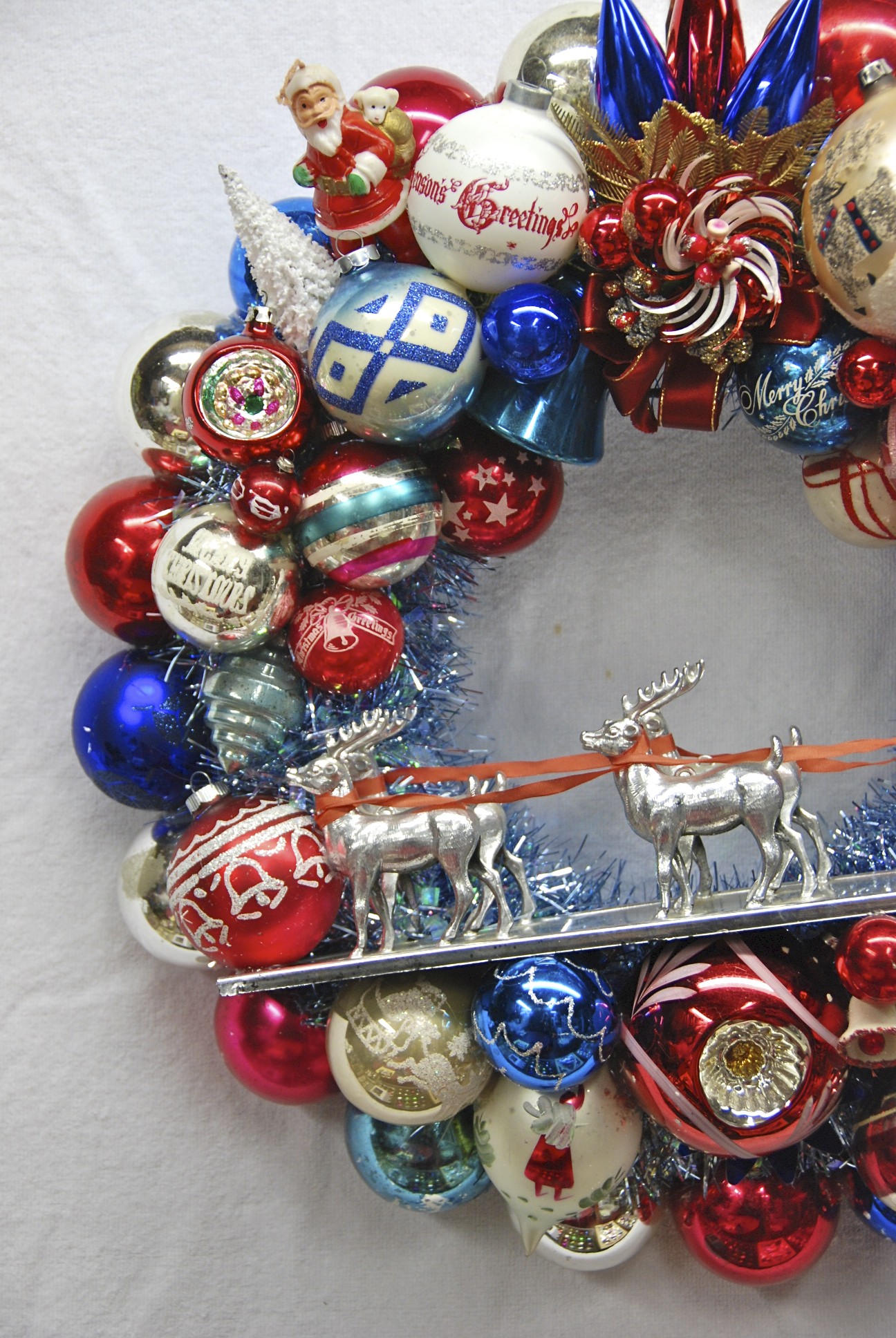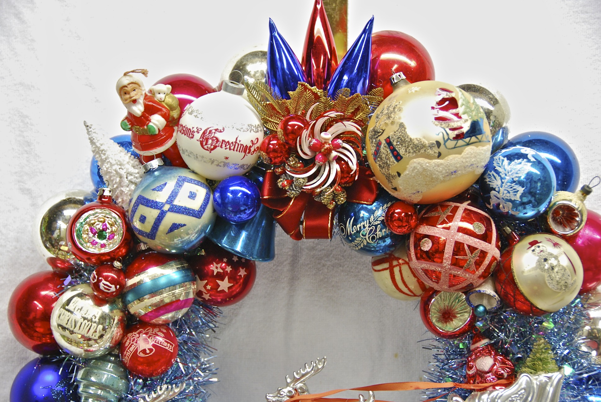 In honor of the birth of the good old USA, here is a new wreath for 2012 in a patriotic palette. A stunning concoction with the perfect colors for an election year. Featuring an unusual sliver plastic sleigh and reindeer with Santa and tree aboard, a wonderful jumbo Poland painted ball, and a host of other treasures. Let the fireworks begin!