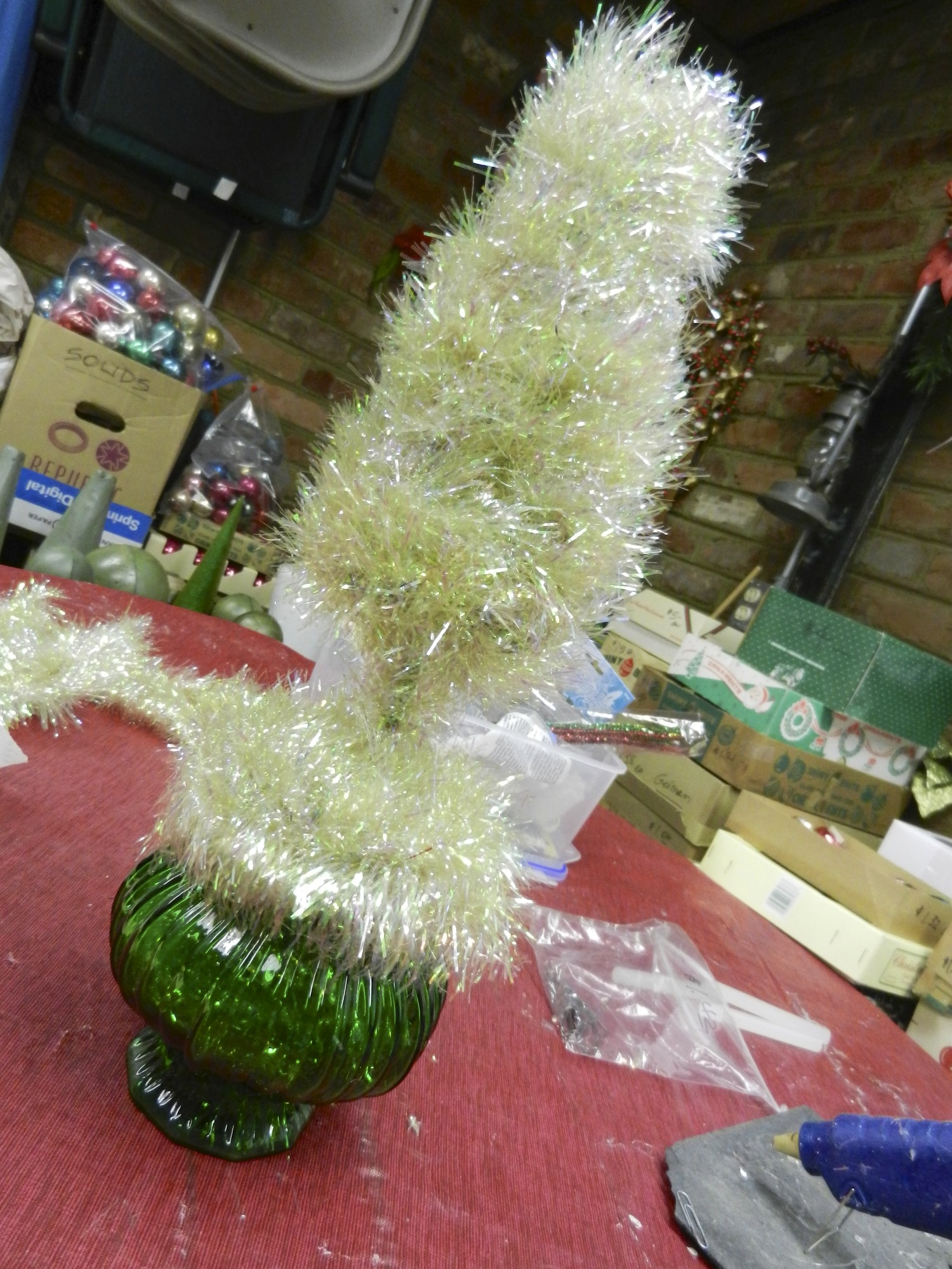 It’s not going well. In fact, I’m hating it. The idea was to try something a little different and come up with something that would be less pricey, too. I started with this vintage USA green glass vase, a topiary form, and some vintage garland. So far so good.