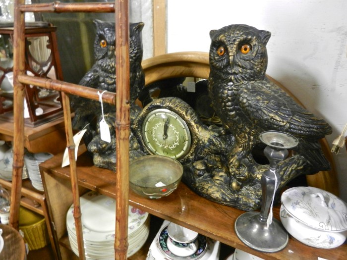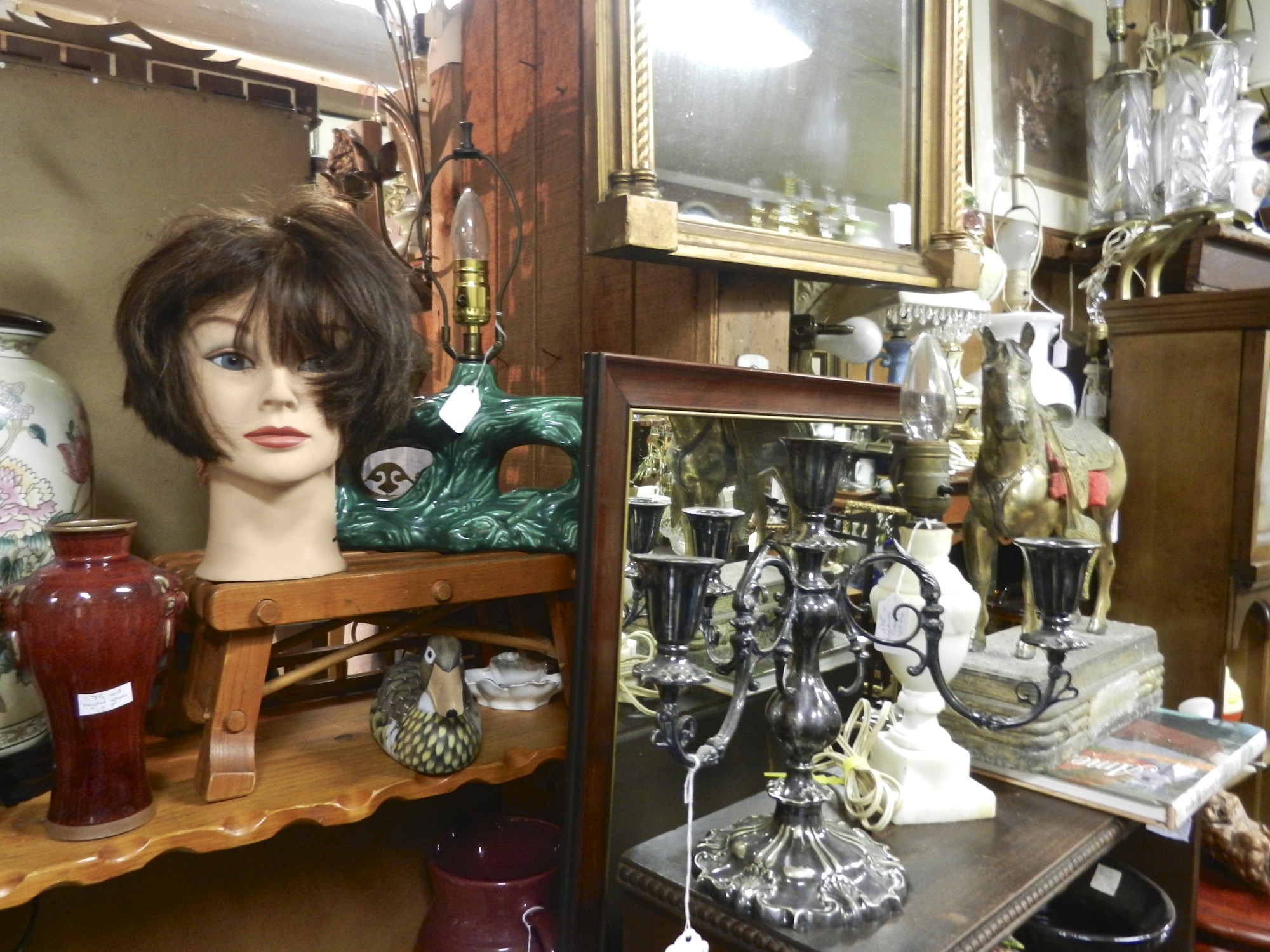 I always get a giggle when confronted with a bewigged head. Pretty cool candelabra though and a nice little alabaster lamp behind it.