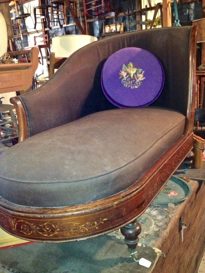 Or this Victorian fainting couch with lovely inlay and a pretty needlepoint pillow. I wondered whether it might be a nice thing in my hopefully soon-to-be-reality garden room but decided it might not be comfy enough. It’s a bit short, to. Still, reupholster it in a fabulous fabric and it would be divine. Hmmm, maybe I should consider it for the bedroom..