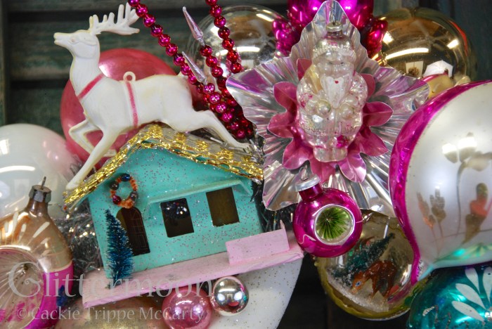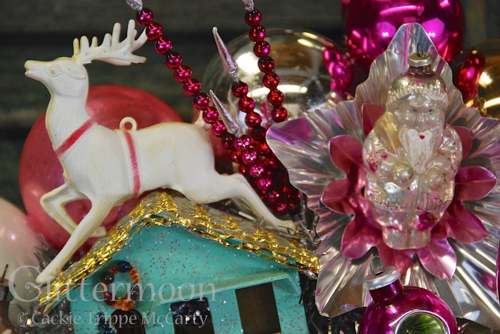 And here is that showstopper of an ornament that first got me going. It is way bigger than my hand. That’s vintage aluminum garland dripping out from behind it with a hot pink pick to complete the statement.