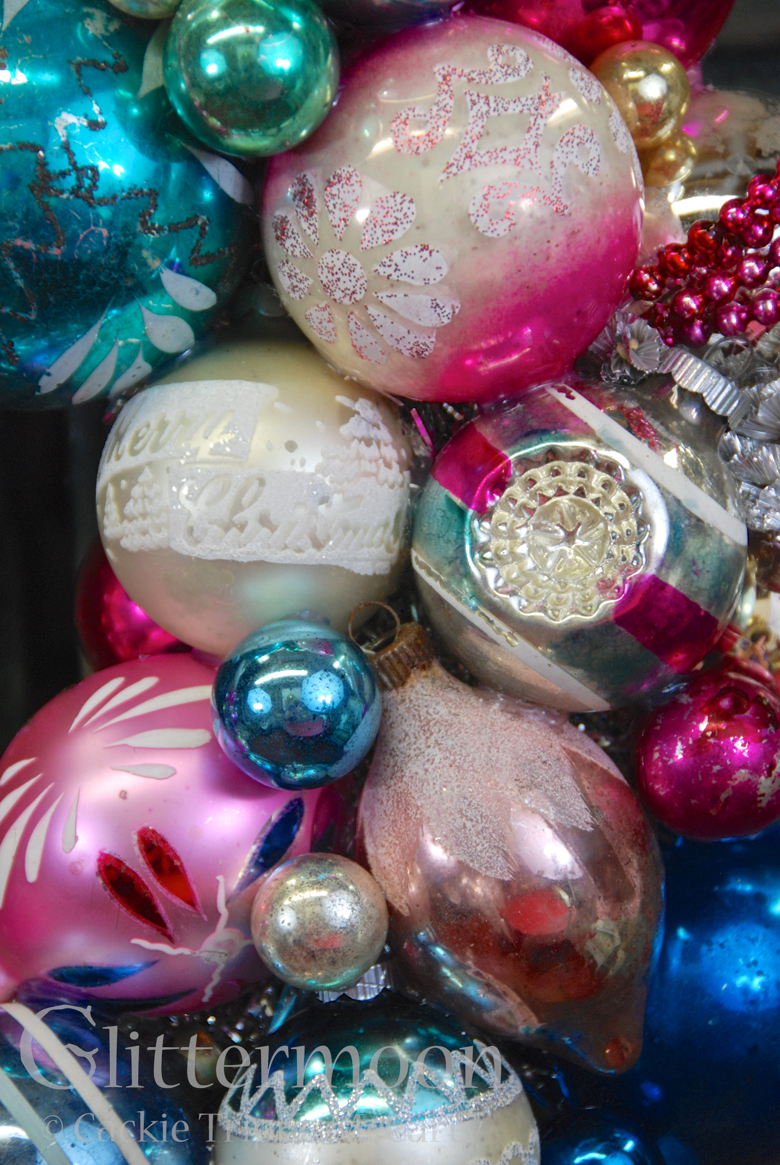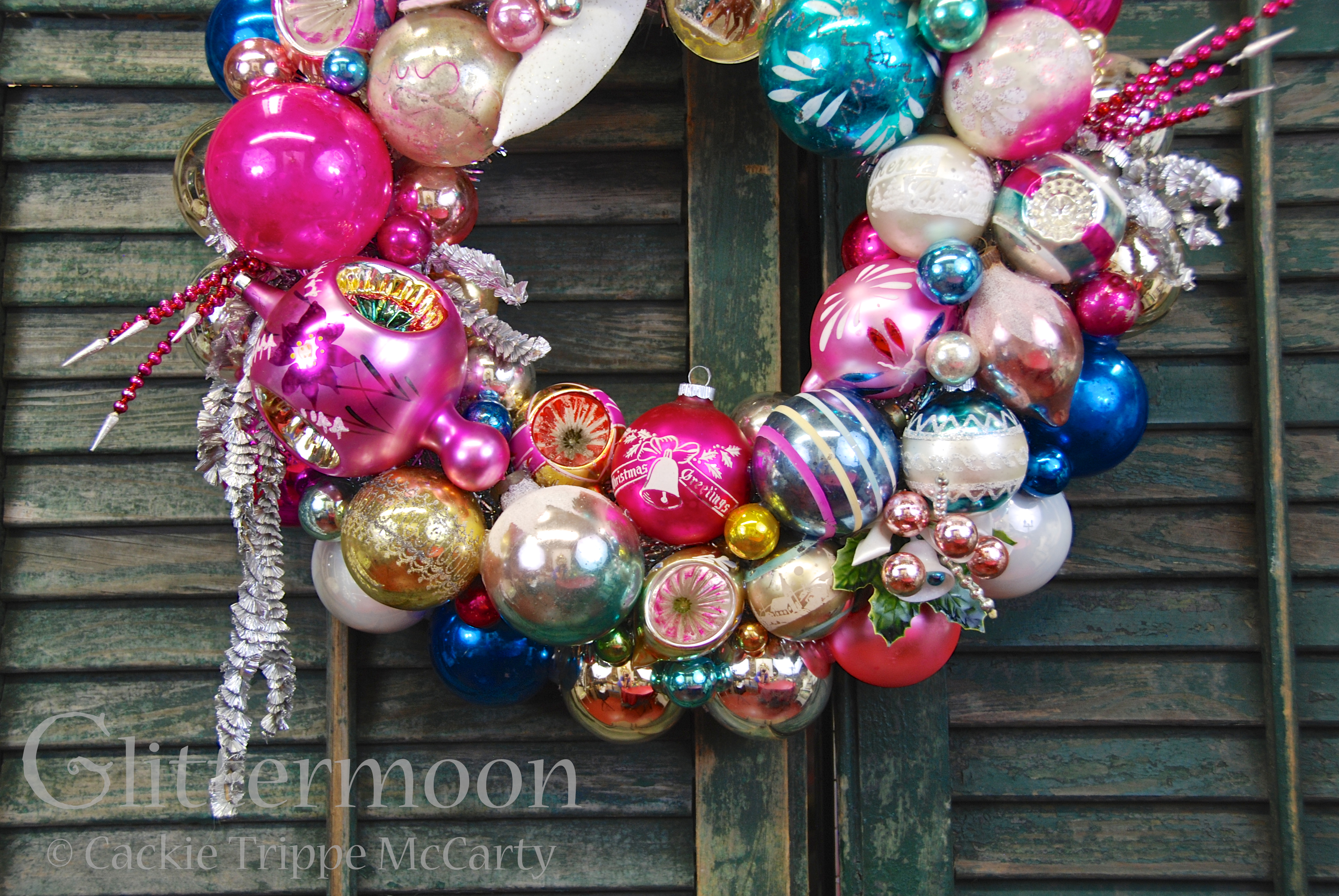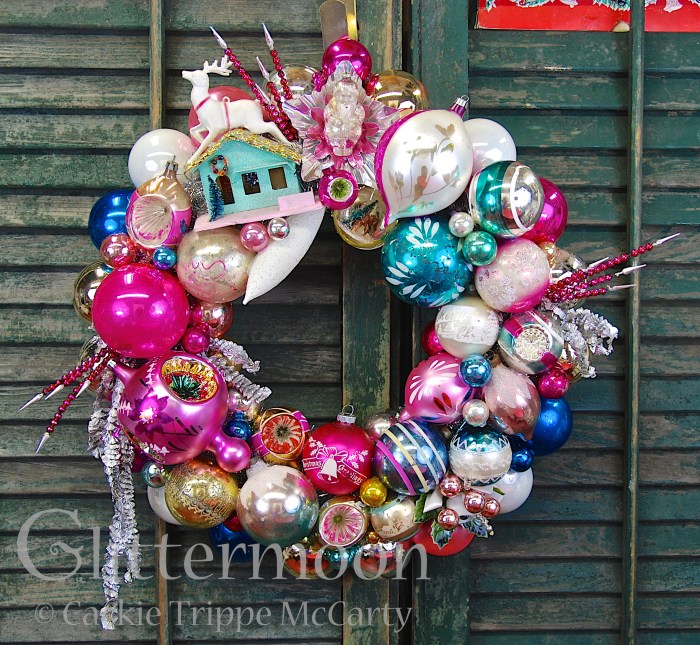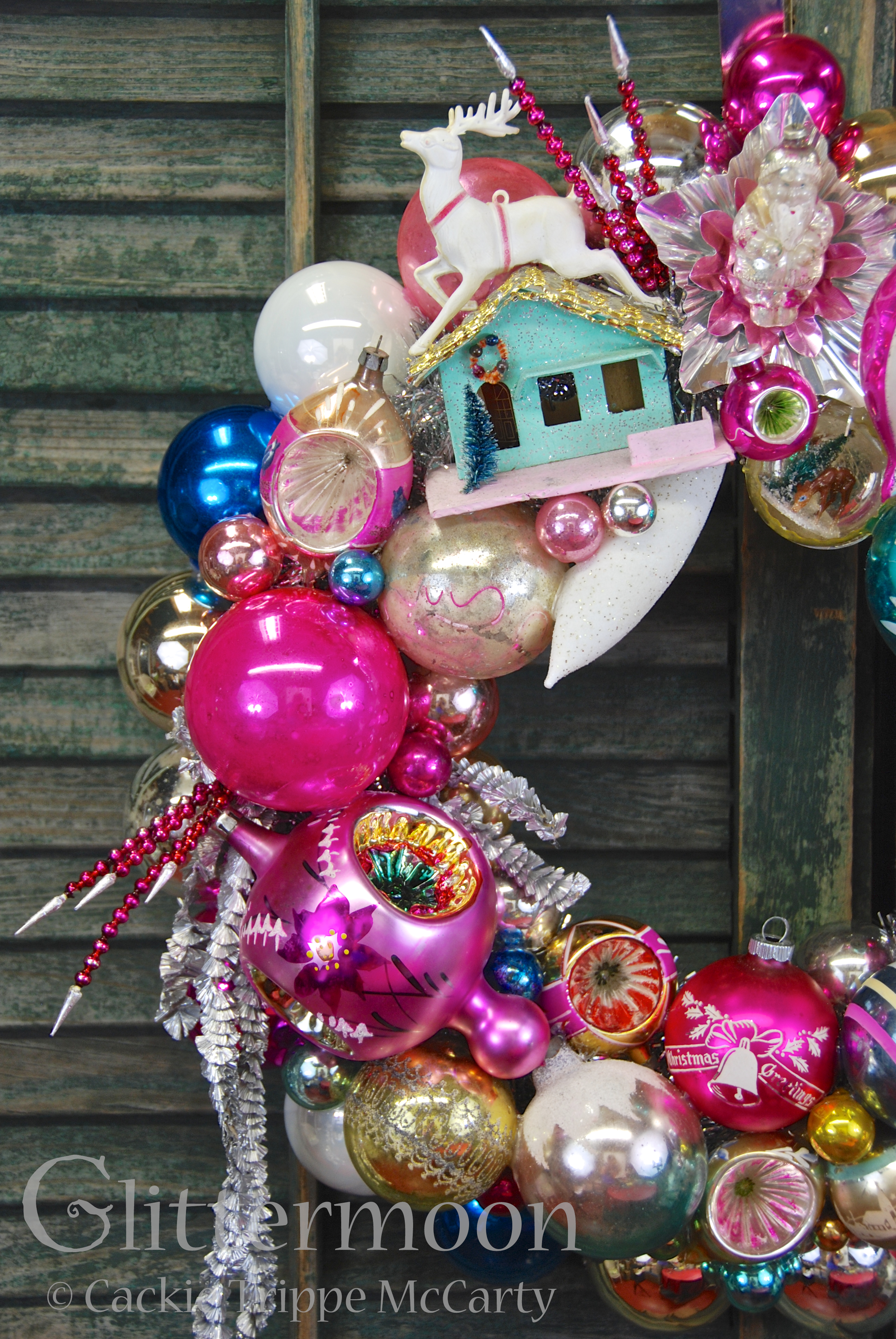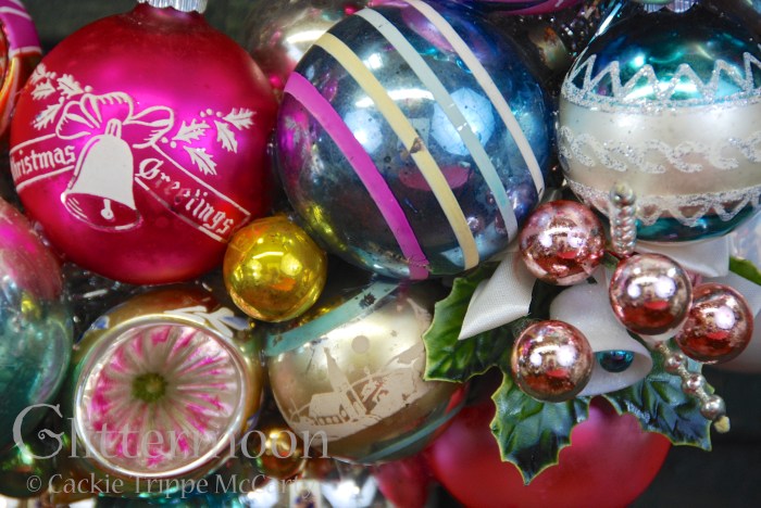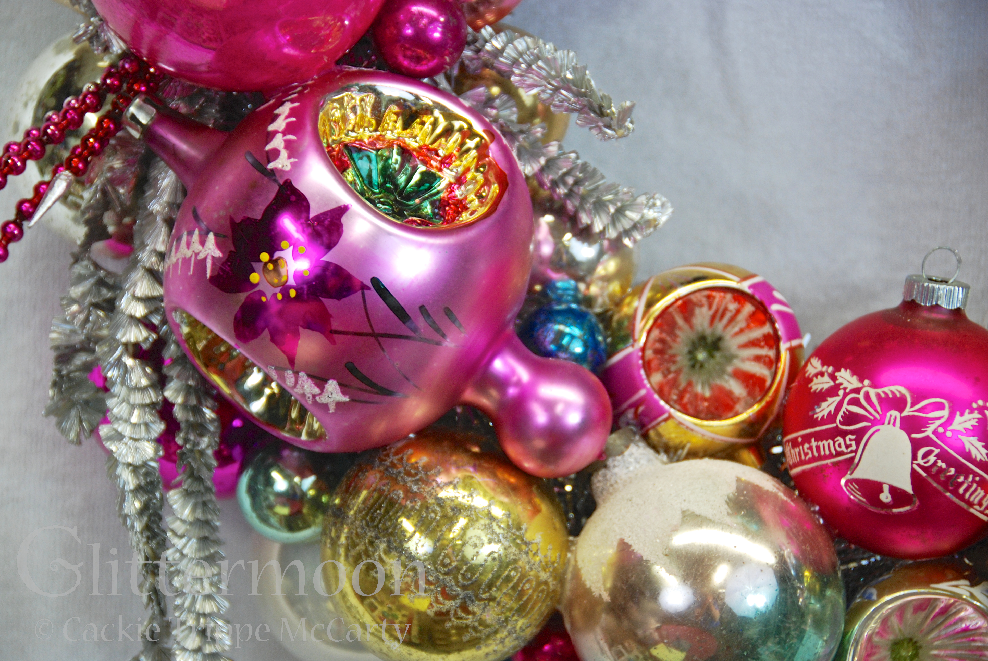 A comprehensive view of the wreath’s bottom half. I really love the hot pink Shiny Brite ball that has the bell and “Christmas Greetings” stenciled on it.
