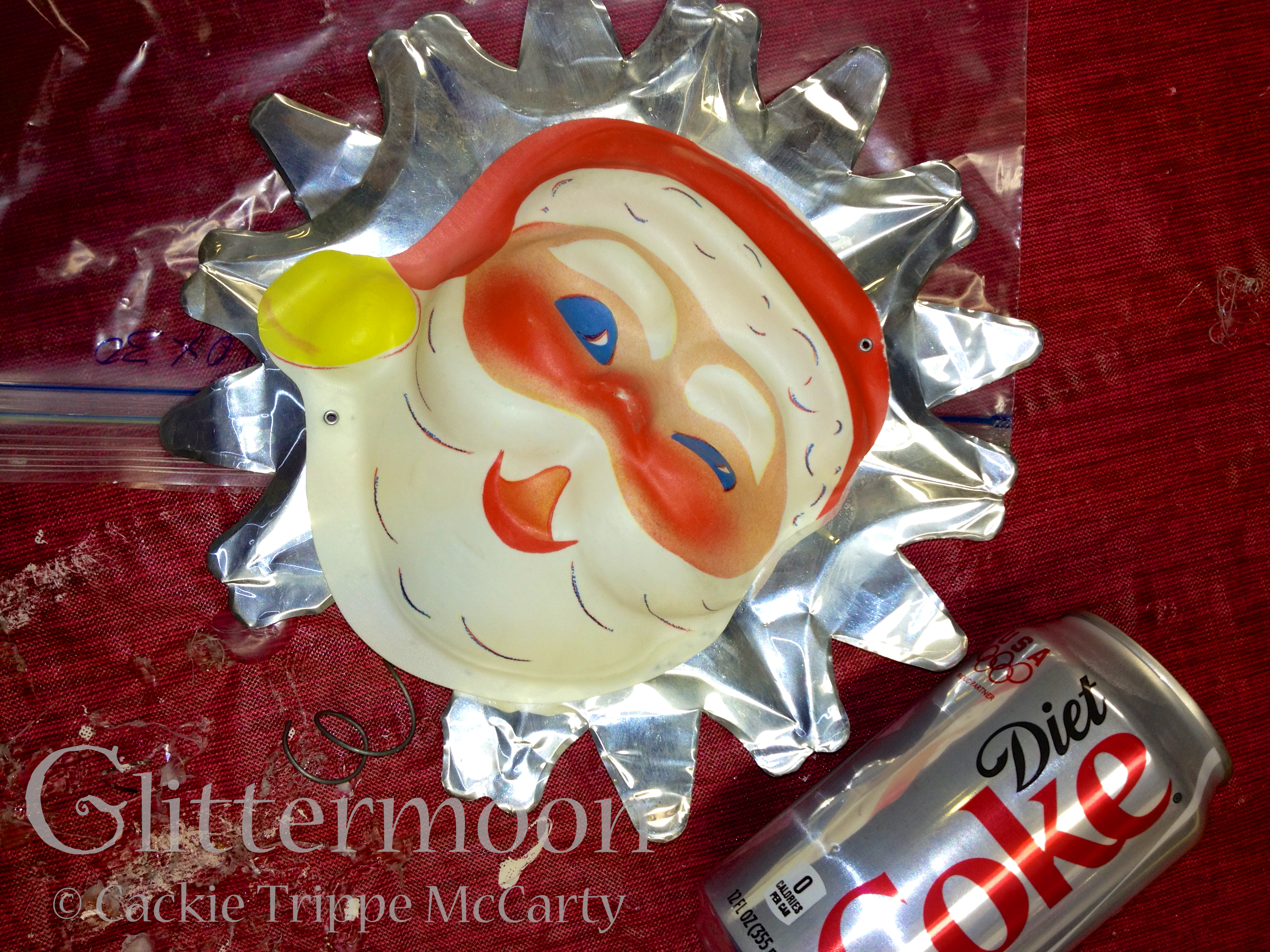 But I do want to leave you with a little teaser.  This wonderful Santa tree topper is the centerpiece for one of the new wreaths.  I put the Diet Coke can next to it so you can see how big it is.  The finished wreath is a lollapalooza.  This is what one of my friends remarked upon seeing it: “Spectacular!!!!! It looks like Christmas threw up! I love it. You could call it No Grinch Here!!”