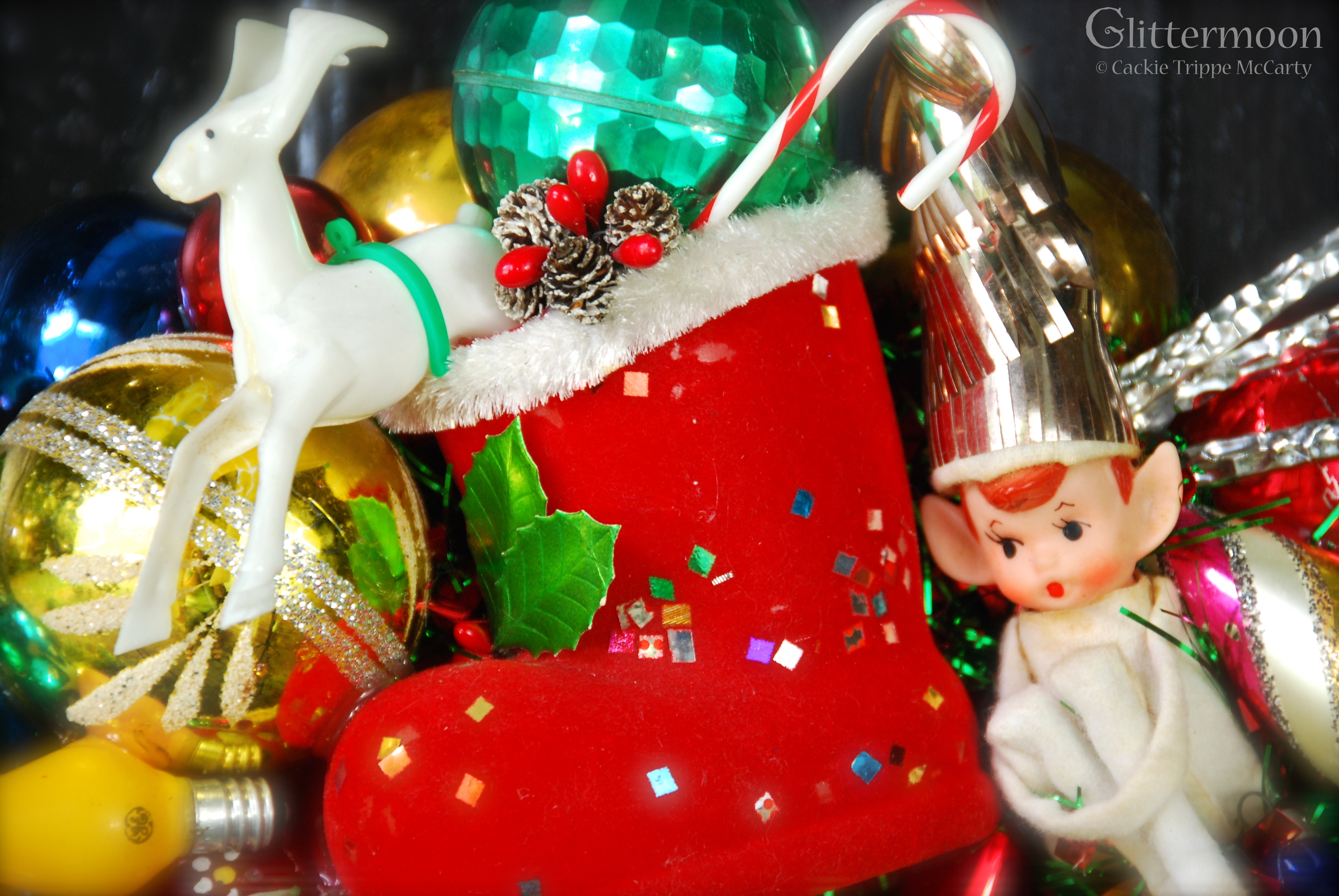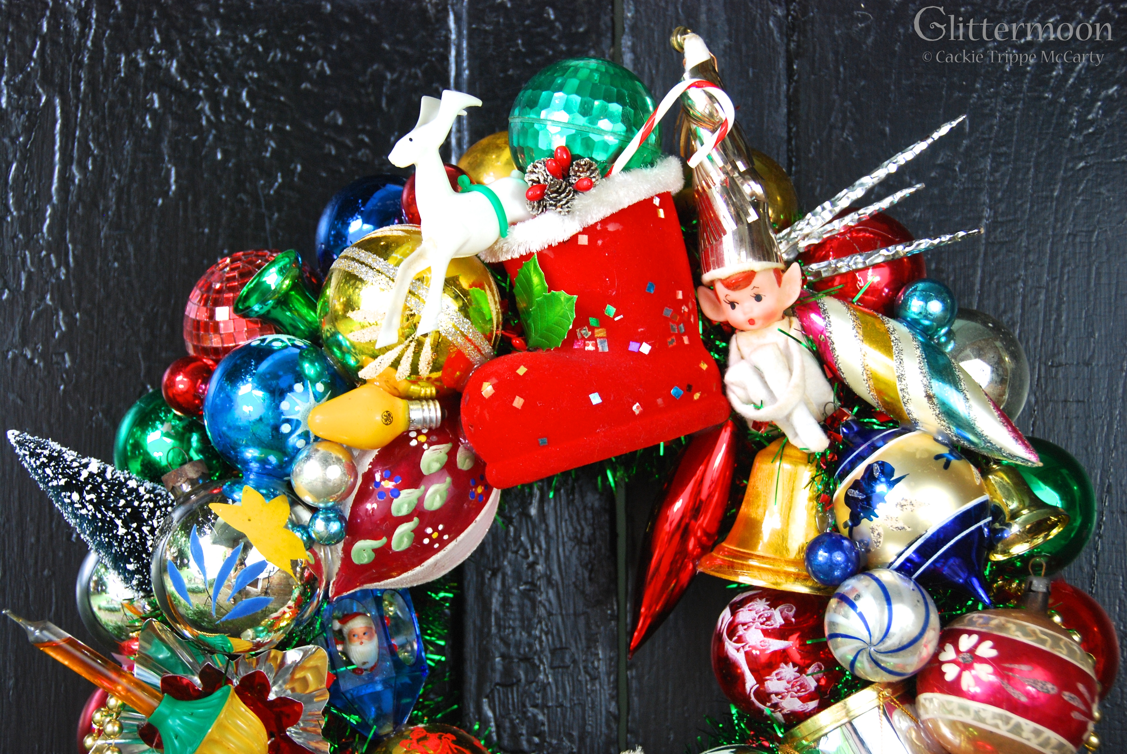 Detail of Happy Memories Wreath © Glittermoon Productions LLC 2013 7Here is a look at the top half.  The boot is so much fun with a reindeer jumping out of it, a disco ball, and a candy cane.  I adore the little kneehugger elf and his fancy pants hat.Detail of Happy Memories Wreath © Glittermoon Productions LLC 2013 8This is the bottom half.  That Santa face sends me – he has a great countenance.  Sometimes Santas can have a slightly creepy expression – but not this guy.Detail of Happy Memories Wreath © Glittermoon Productions LLC 2013 4