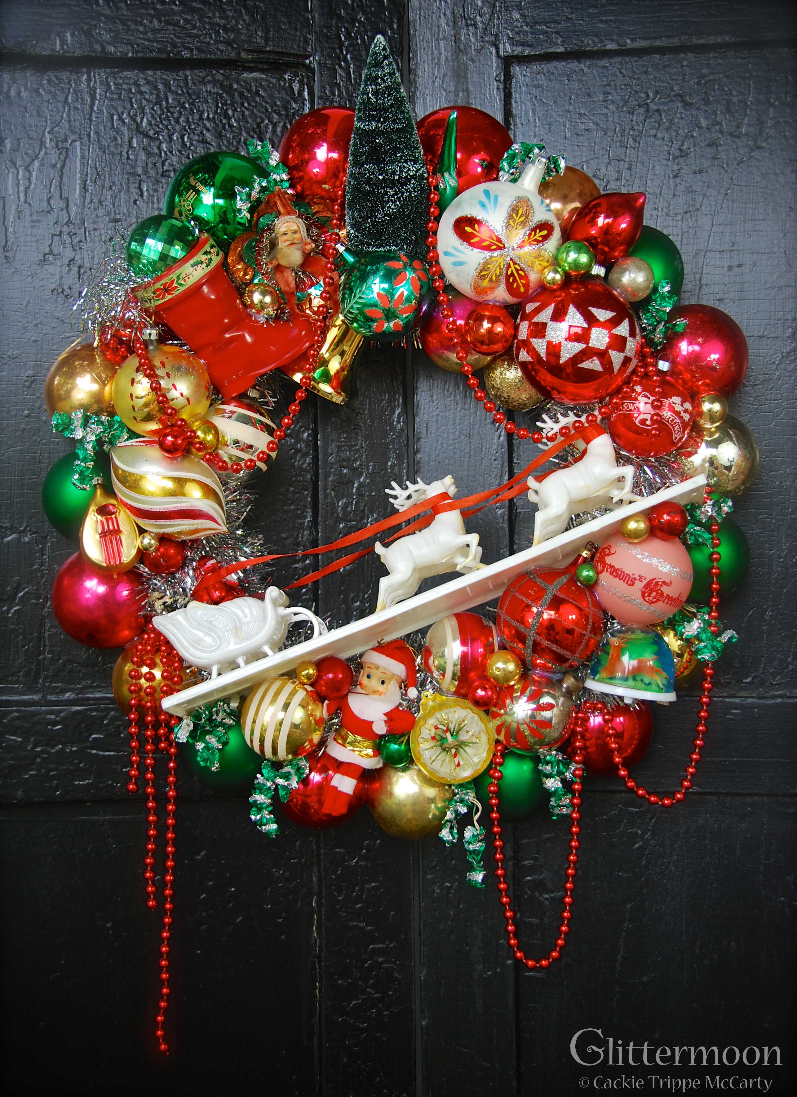 Remember my last post where I showed you a bunch of these wonderful plastic Santa mantel pieces? This is what I made with one of them. There are some other really neat pieces on it, too, including that old chenille Santa at the top (look closely), the vintage boot right next to him, and the little elf on the bottom. I also added an honest-to-goodness snow globe at bottom right. See it? It has a reindeer inside it! I am not sure I recommend vigorous shaking at this point, however. 20″ diameter, $250 (includes storage bag)