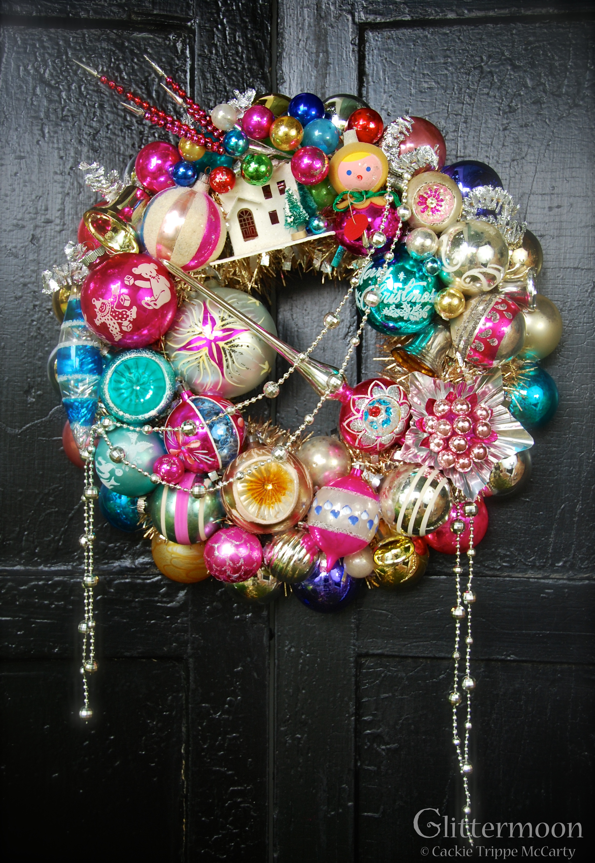 Another 17″ wreath, I named it for the darling little Italian girl who is standing next to her little putz house. She kind of reminds me of Heidi. This one has a cool palette of magentas, teals, silver, and pink. I parted with one of my jumbo Poland balls for this one; it’s the huge ball on top left with the purplish looking poinsettia on it. Also of note is the magenta topper with teal indent. $250 (includes storage bag)