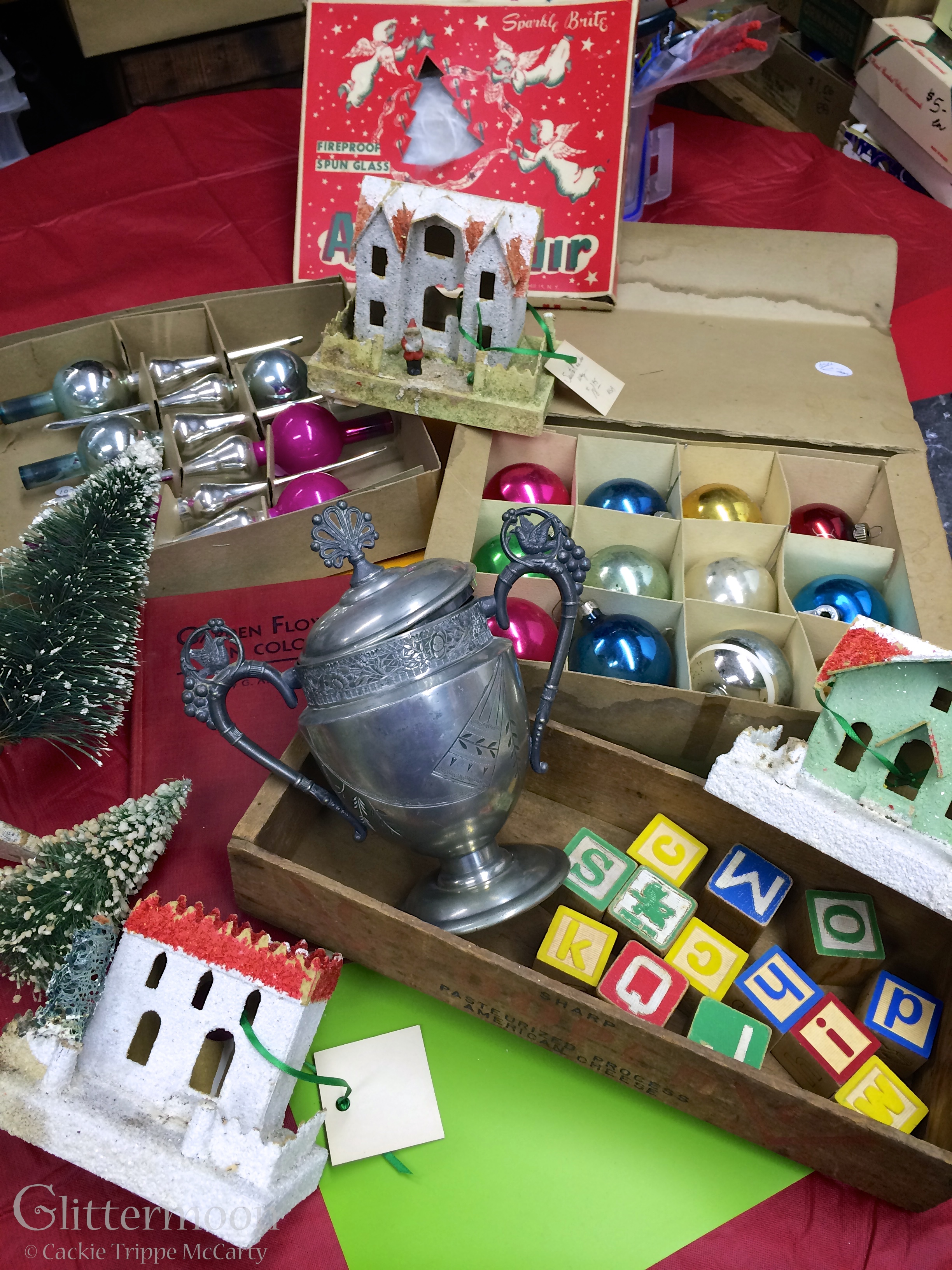 This is just a little bit of what I dragged home.  I think the Victorian sugar bowl will make a wonderful topiary base.  I can use the old wood cracker box to display some Glittermoon Cards at my shows, and the building blocks will be available to purchase at one of the Country Living Fairs.  So will the terrific old “Garden Flowers in Color” book that I unearthed – unless I decide to keep it for my own collection.
