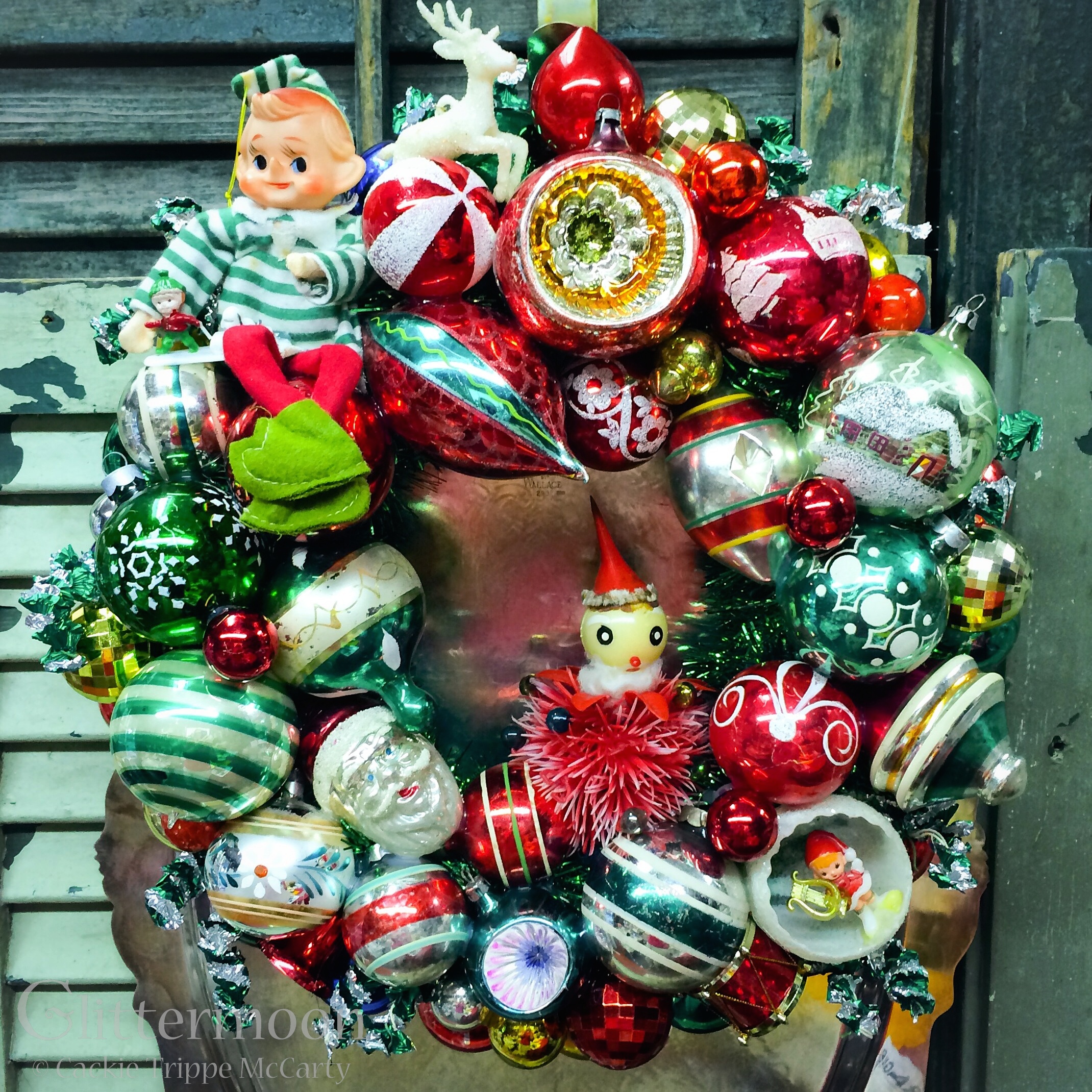 And, finally, this is a finished wreath, a small one (about 15″ diameter) named “Little Elfie.” So much fun packed into a small package.