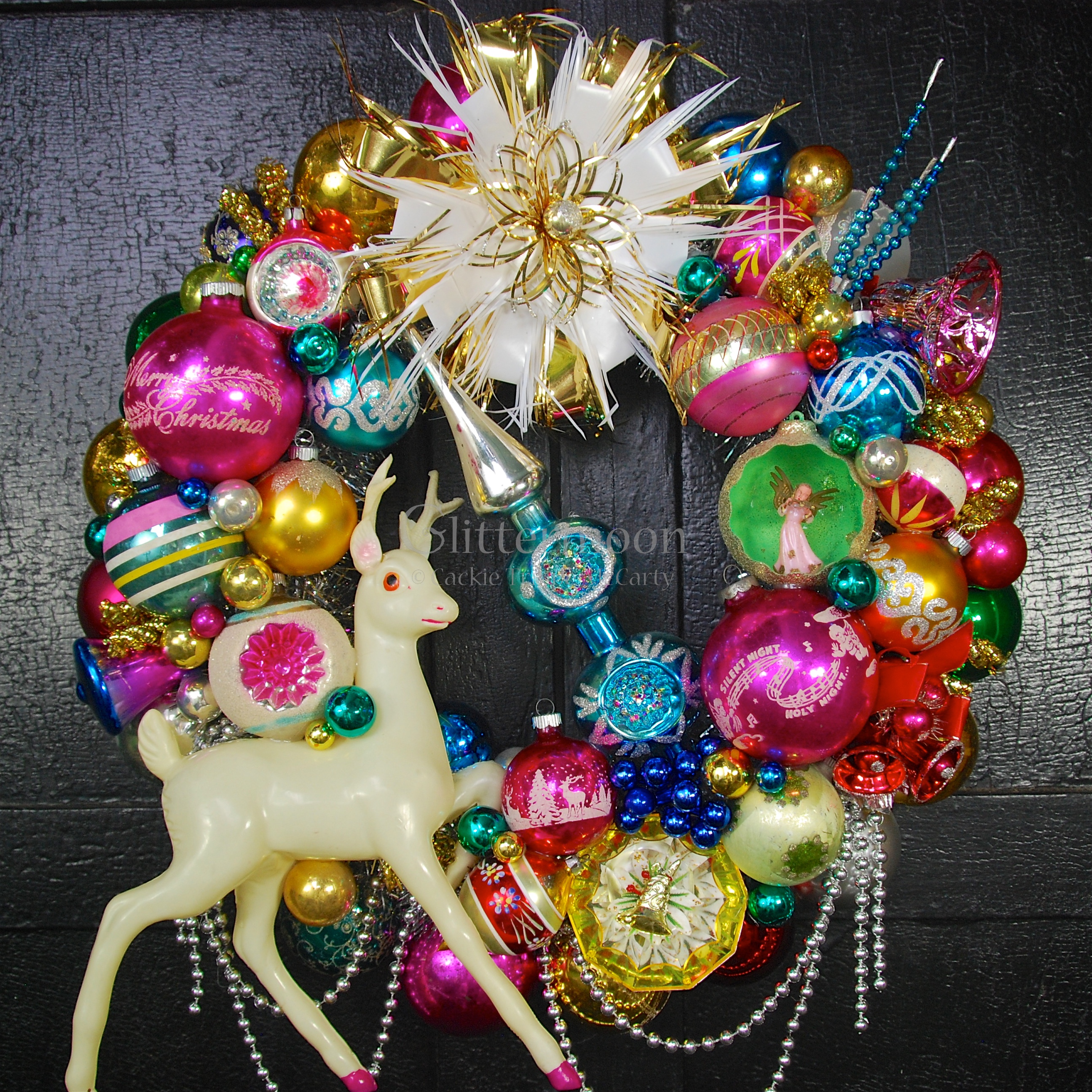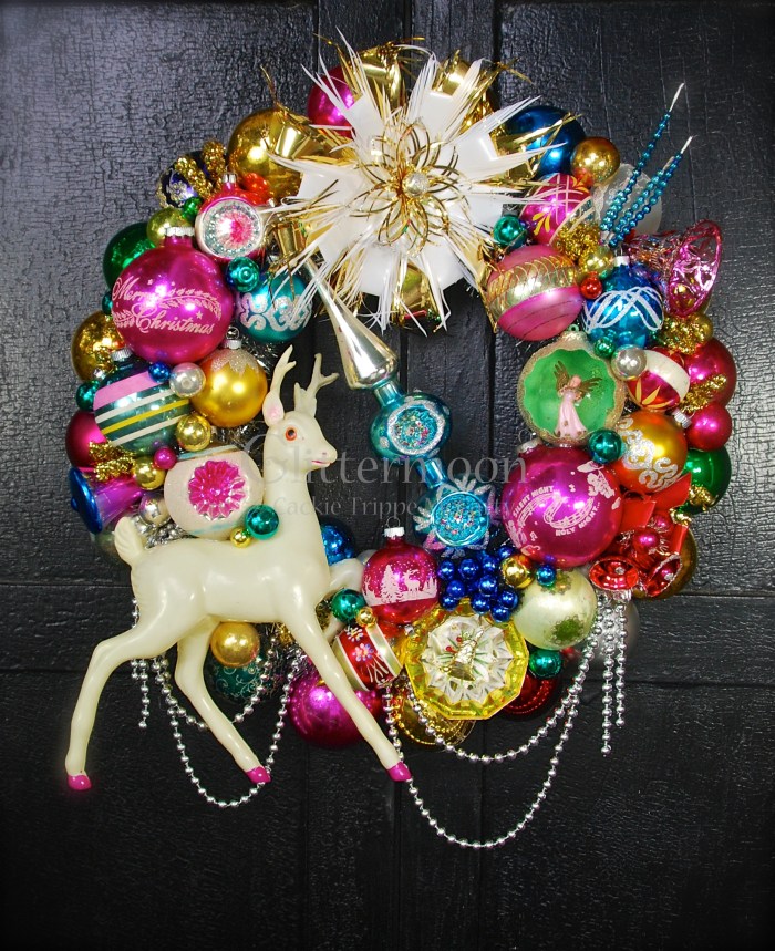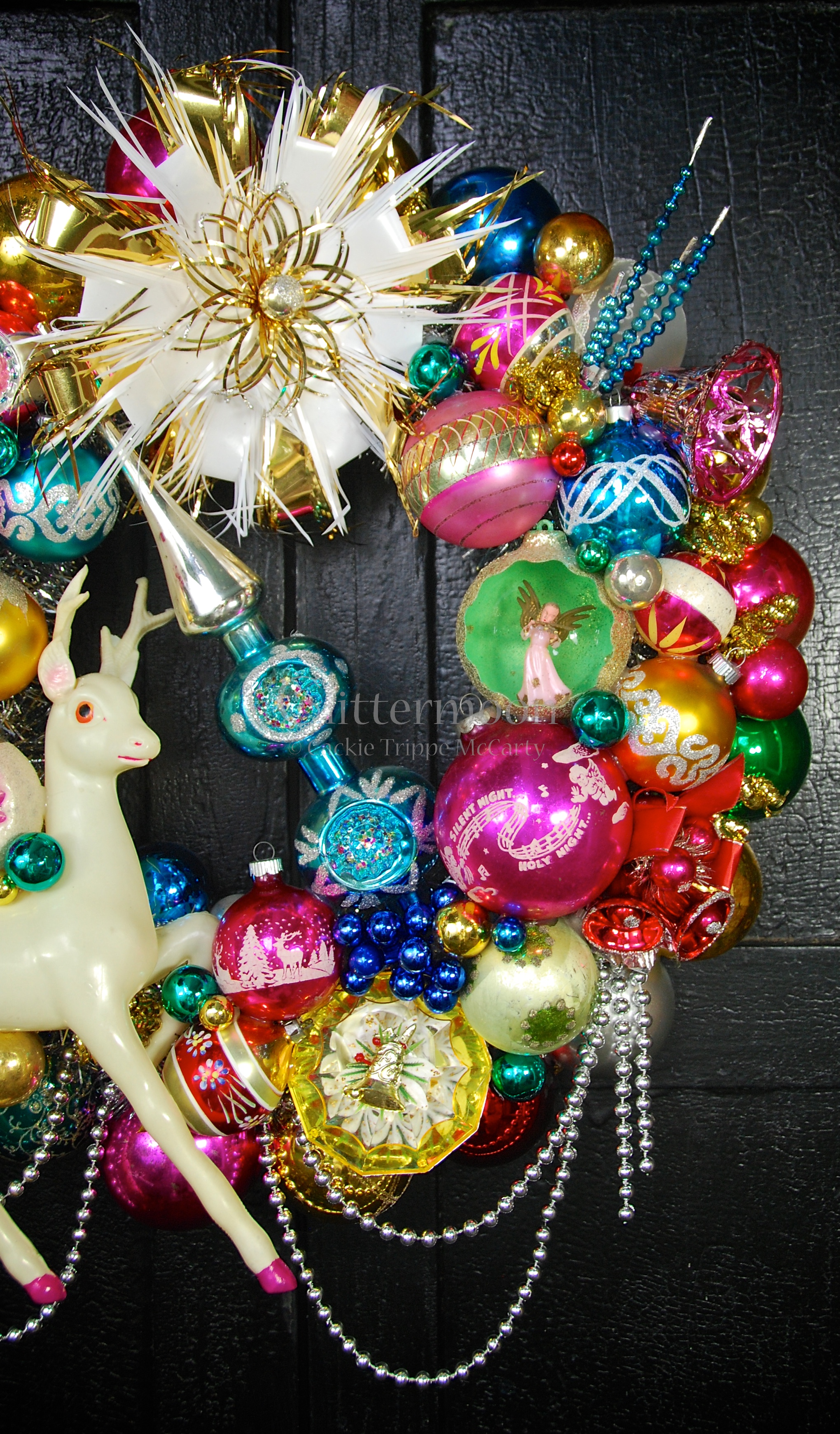 The reason I think it’s special is not only because it’s got some pretty fabulous stuff in it but the color palette is scrumptiously poppy. The huge Japan celluloid/plastic reindeer (he’s about 12″ tall) and the gorgeously flashy enormous white and gold package decoration on top are the tip of the iceberg. There’s also a lovely double-decker indented blue topper slashing its way across the center for one. Other items of note are 2 huge Shiny Brite stencilled balls; 2 Jewelbrite plastic dioramas (the angel and the yellow one on the bottom); a vintage corsage with bells and red ribbon; beautiful indented ornaments; and a host of bells, Shiny Brites, and other lovelies. The colors are hot pinks and golds with shots of white, blue, green and silver. There are swags of silver beaded garland on the bottom as a final elegant touch.