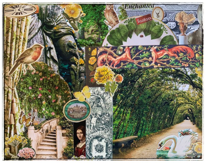 So, for the first time in forever, I made a collage. I have to say it was an almost perfect exercise to keep the demons at bay and, oh my, did it ever feel good to have the creative juices flowing again. This is what I came up with…a sort of Italianate/Into the Woods fairy tale.