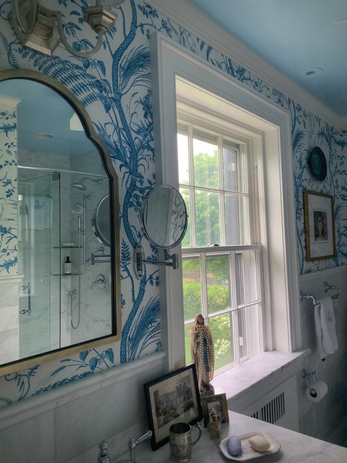 Pre-Covid seems a very long time ago indeed and so much has changed. We were supposed to have our house and garden open in May for a tour in our Ginter Park neighborhood but, of course, that had to be scratched. As of this writing, it has been rescheduled for May 1, 2021. Put it on your calendar now! Naturally, we were in the midst of several house projects trying to get ready for the tour. I was still finishing up the bathroom renovation that began 18 months ago now 😳 and I was working on refreshing some of the downstairs rooms. And then, everything ground to a halt. At this point, most of those projects have now been finished – yay – and I’ve begun working on the upstairs which has started to look tired after 25 years. If you remember way back to last year, we were doing a total gut renovation of the master bathroom. To give you an example of how looooong the bathroom took, I just got the new curtain, actually an antique pillow sham that we repurposed, up in the window last week! The master bedroom (which was the workshop during the bath reno and thus completely trashed) is all pretty and fresh now and I could not be happier with how both it and the bathroom turned out. I’ve moved on to the tiny little room I call my “perch” and things are proceeding at a sedate pace but that’s just fine with me. Here’s a peek at how the bathroom looked once I hung pictures but before the new curtain. You can refer back to this post from a year ago to see the “before.”