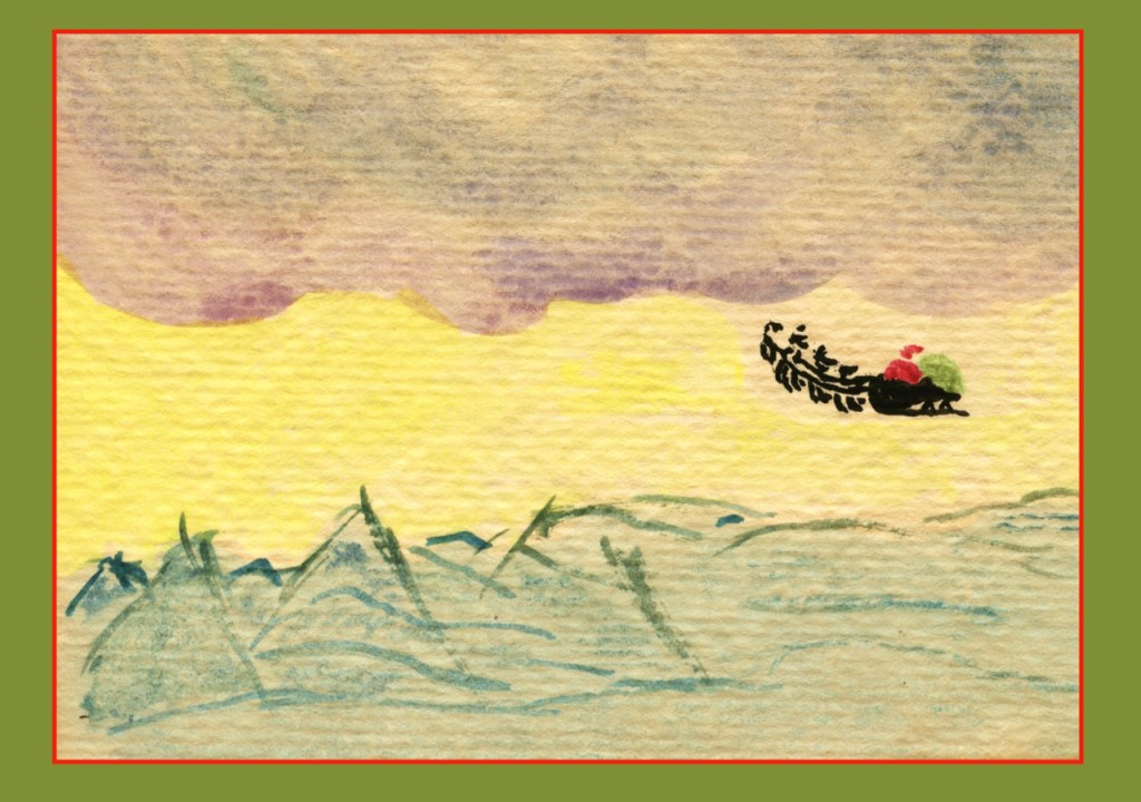 On another note, I have a new Christmas Card for 2023. It is called “Santa’s Flight” and it features a wistful, whimsical watercolor my husband, Patrick, painted in 1995. I have it – and all my other Holiday/Christmas cards, listed in my Etsy Shop. If you are in the Richmond area, I hope to have Holiday cards in my space at Crossroads Art Center by early next week. Have a peek at “Santa’s Flight” below: