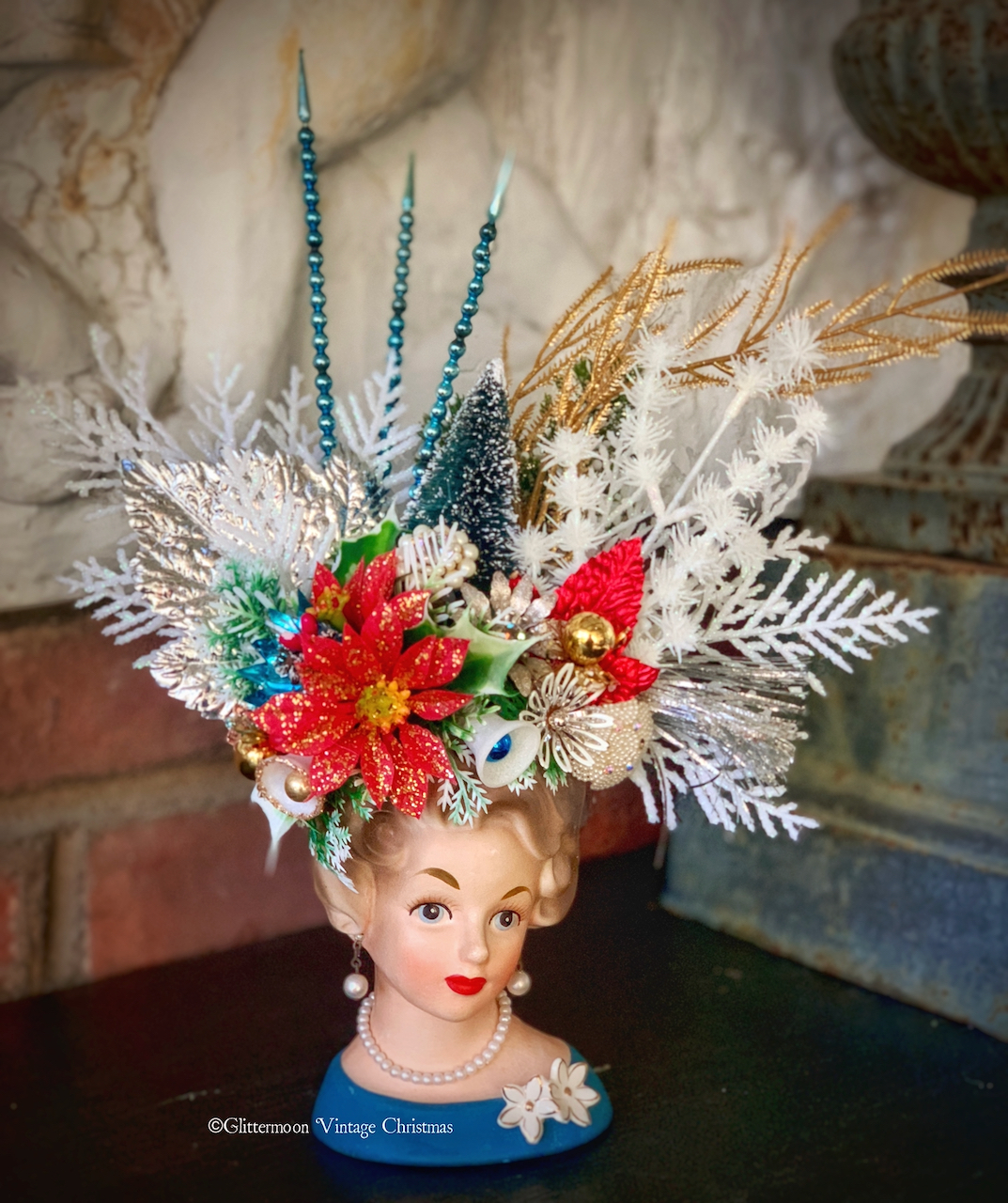 On the right is “Constance,” a vintage Unesco (made in Japan) lady head vase for whom I made an elaborate holiday headdress last year. I had her in my collection but she has signaled that she’d like to go somewhere a bit more exciting than my house, so I am giving her her wings.
