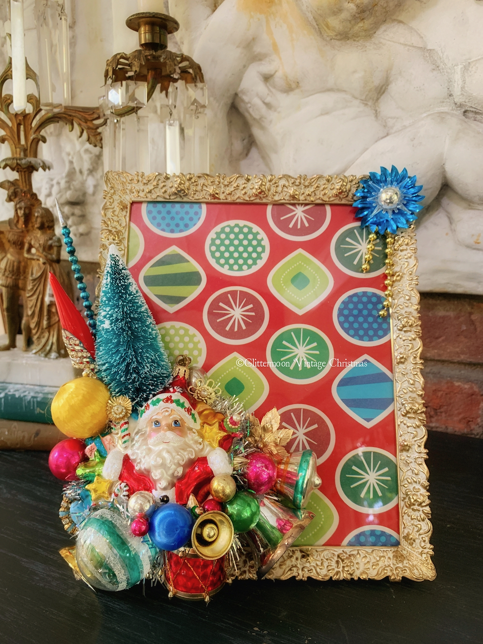On the left is a project I have wanted to try for a long time, a picture frame, and I finally got all the pieces together to do it. That Santa is actually a broken Radko ornament (do not worry – it is strong as an ox and I have reinforced it further). Santa is surrounded by loads of little things from old ornaments to vintage bits of jewelry and other tiny accents. You could put a holiday favorite photo in the frame – or perhaps a piece of old ephemera or even wrapping paper, as I did. Or even a mirror!